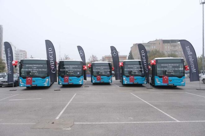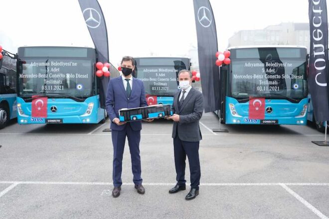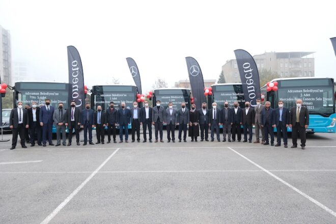 Adıyaman Belediyesi, toplu ulaşım hatlarında kullanılmak üzere 5 adet 2021 model Mercedes-Benz Conecto Solo aracı, Adıyaman Belediye binasında düzenlenen törenle teslim aldı. Adıyaman halkına hizmet verecek olan Mercedes-Benz Conecto Solo; şehir içi otobüs sektöründe Türkiye’de ilk defa sunulan çarpışma önleyici fren asistanı ve dönüş yardımcısı gibi güvenlik donanımlarıyla fark yaratıyor. Dünyanın en modern otobüs fabrikalarından olan Hoşdere Otobüs Fabrikası’nda üretilen Mercedes-Benz Conecto Solo, tam alçak tabanlı yapısıyla geniş bir iç mekâna sahipken; ekonomik ve çevreci E6 motoruyla benzersiz yakıt ekonomisi sağlayan reküperasyon (geri kazanım) modülünü de barındırıyor. Sadece yeni Conecto otobüslerinde bulunan bu modül sayesinde otobüsün gazsız sürüş ve frenleme sırasında depoladığı enerji, ilave yakıt tasarrufu olarak geri dönüyor. Yangın ikaz ve söndürme sistemi, engelli rampası, otomatik klima sistemi gibi pek çok aksesuarla donatılan Conecto Solo, yüksek güvenlik ve konfor standartlarını bir üst basamağa taşıyor.