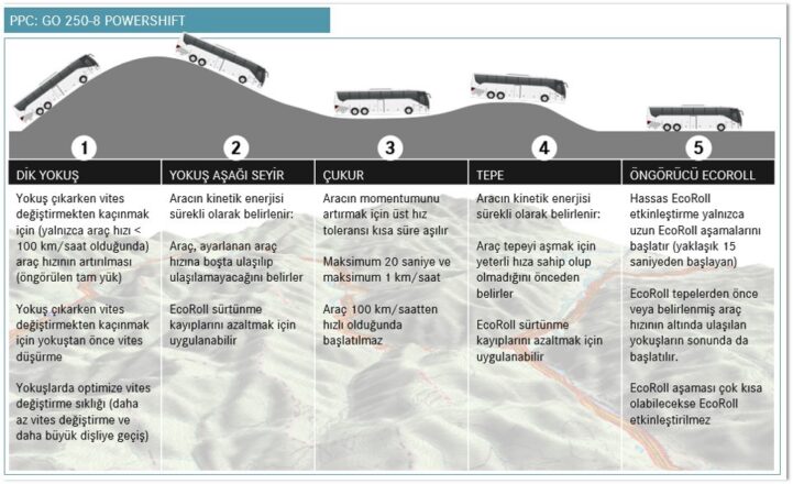 - Öngörülü Sürüş Sistemi (PPC) sayesinde Mercedes-Benz, yakıt ekonomisi ve konfor alanında bir diğer yeniliği daha Travego 15 ve Tourismo modellerinde sunmaya başladı. Avrupa ve Türkiye otoyollarının yüzde 95’ini kapsayan dijital yol haritaları ve GPS bilgileri kullanılarak, vites değişim zamanları ile vites seçimlerinde optimizasyon sağlayan sistem, yakıt tasarrufuna katkıda bulunuyor. Öngörülü Sürüş Sistemi, hız sabitleme sisteminde kaydedilen hızın belirli bir tolerans değerinde üzerine çıkabiliyor veya altına inebiliyor. Bu sistem tüm fonksiyonlarıyla kullanıldığında sadece yakıt tasarrufu sağlamakla kalmıyor aynı zamanda sürücünün yükünü de hafifletiyor.