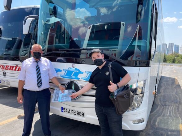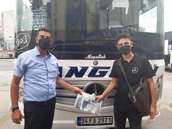 Aktivite kapsamında otobüs yolcuları da unutulmadı. Otobüs seyahatlerinde güvenle yolculuk etmek isteyenlere antiseptik mendil ve Mercedes-Benz logolu özel maskelerden oluşan hijyen kiti hediye edildi. Yolcular antiseptik mendilin üzerinde yer alan QR kodunu okuttuklarında Mercedes-Benz’in internet sitesinde yer alan yeni aktif filtre donanımları hakkındaki bilgilendirme kısmına kolaylıkla ulaşabiliyor. Yolculara aynı zamanda “Otobüslerimizde Temiz Hava ile Güvendesiniz” başlıklı, Mercedes-Benz’in geliştirdiği “Antiviral Filtre” ve “Taze Hava Yazılımı” hakkındaki bilgilendirme broşürleri dağıtıldı. Bu broşürlerde yolcuların, aktif filtre donanımına sahip olan araçları nasıl tespit edebilecekleri ve bilet alırken yazıhane personelinden bu türdeki araçları nasıl öğrenebileceklerine dair bilgilendirmeler gerçekleştirildi.
