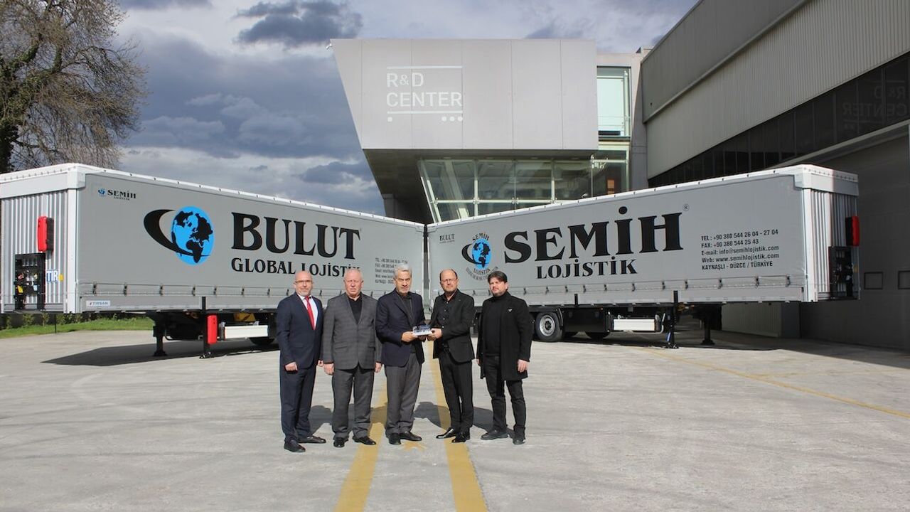 Semih Lojistik yeni araçlarını Tırsan Adapazarı Mega Üretim Kampüsü’nde gerçekleştirilen tören ile teslim aldı. Tırsan Treyler Yönetim Kurulu Başkanı Çetin Nuhoğlu’nun ev sahipliğinde gerçekleştirilen törene; Semih Lojistik ortakları Güngör Bulut, Necmettin Bulut, Hasan Bulut ve Tırsan Treyler Satış İcra Kurulu Üyesi Recep Demirci katılım gösterdi.